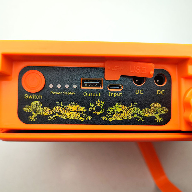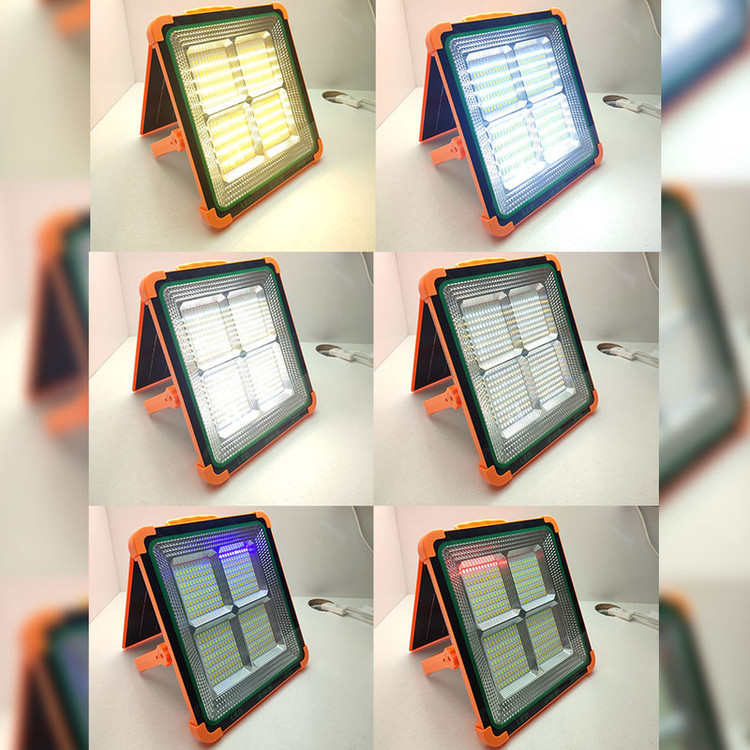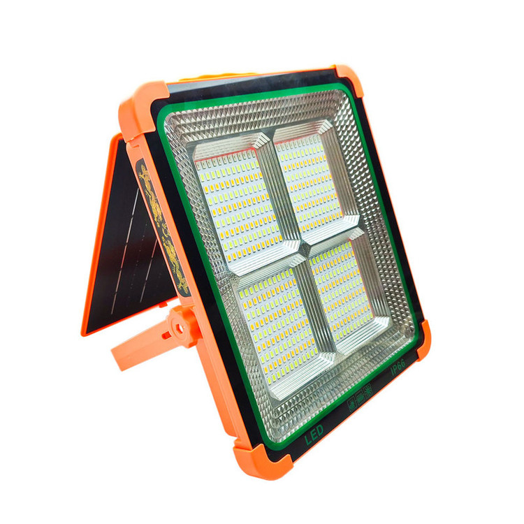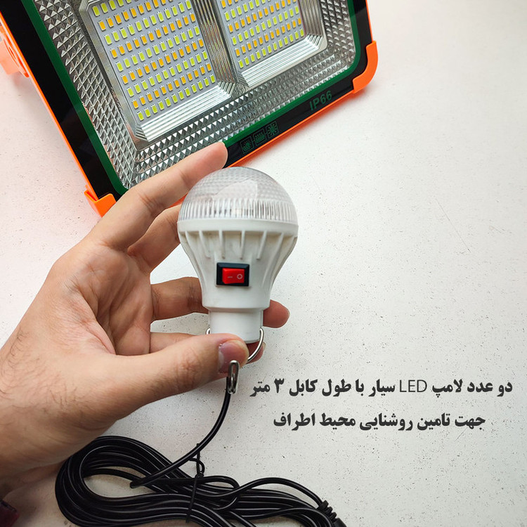 این چراغ شارژی یک نور افکن قوی و خوش ساخت با طراحی استاندارد است که مناسب روشنایی بیرونی در شب، برای کمپینگ، کوهنوردی، معدن، تعمیر ماشین، نگهبانی و… است. در ساخت این محصول از مواد بااستحکام پلاستیکی ABS استفاده شده است. تامین انرژی این چراغ قوه از طریق باتری داخلی قابل شارژ توسط پورت USB همراه با دو پنل خورشیدی بزرگ و قوی است که به راحتی در صورت نبود برق با انرژی خورشیدی شارژ می شود. این چراغ قوه در صورت شارژ کامل حدود 4 ساعت با حداکثر روشنایی نوردهی می کند. بهره مندی از کلید فیزیکی بر روی بدنه به منظور روشن خاموش و تغییر حالات نوردهی از دیگر ویژگی های این محصول است و همچنین بهره مندی از پنل خورشیدی بر روی بدنه به منظور شارژ دستگاه، دارای پورت USB جهت شارژدهی (به عنوان پاوربانک) در مواقع اضطراری دارد. این چراغ قوه شارژی از چهار چیپ SMD پروژکتور تشکیل شده از در قسمت جانبی می باشد. مجهز بودن به دسته جهت حمل آسان تر، غلاب آویز و بدنه کاملا ضد آب IP66 از مزیت های این محصول است. حالت نوردهی این پروژکتور در حالت آفتابی، مهتابی، نچرال 100%، نچرال 50% و حالت چشمک زن پلیسی می باشد. ویژگی منحصر به فرد این پروژکتور کمپینگ وجود 2 پورت DC می باشد که میتوان 2 عدد لامپ LED سیار همراه محصول را متصل و روشن کند که با وجود طول 3 متری لامپ ها روشنایی تمام محیط تامین می شود.