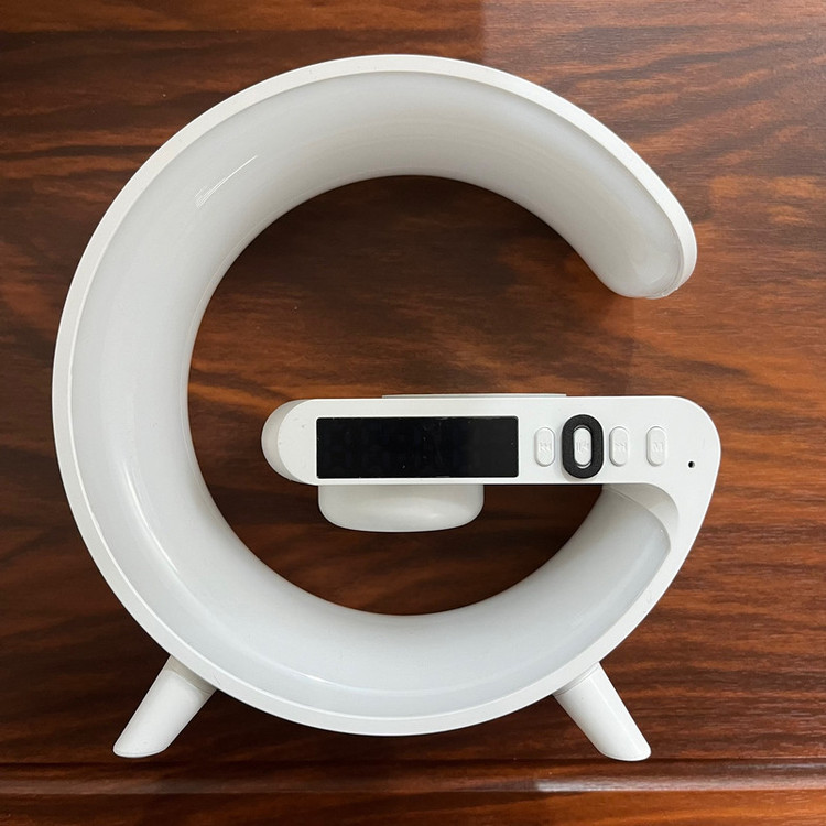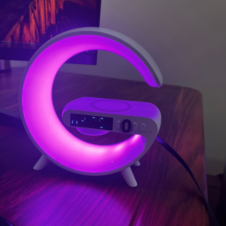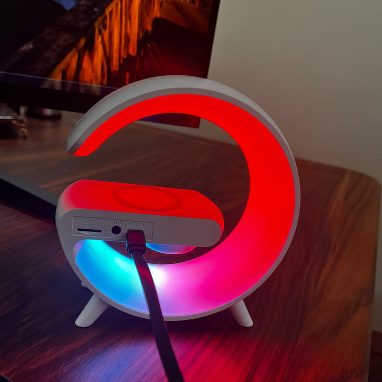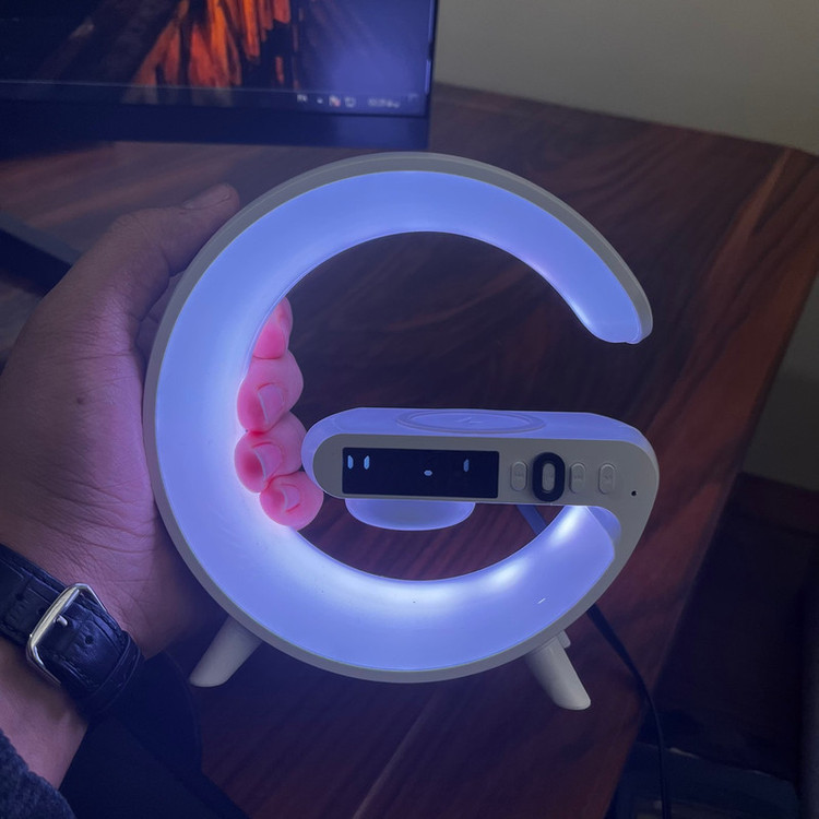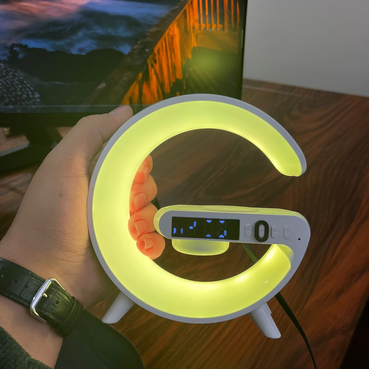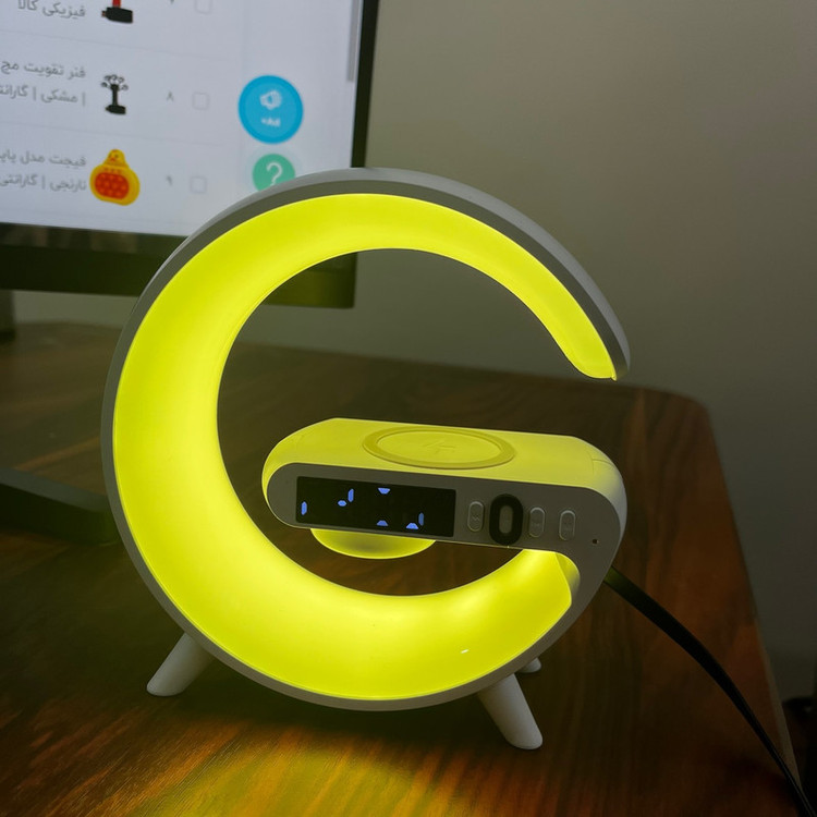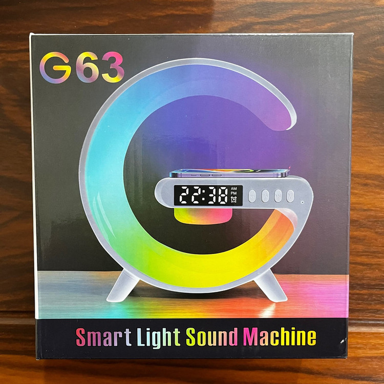 چراغ خواب هوشمند RGB مدل G63 طرح اسپیکر دار ، یک گجت چندکاره است که علاوه بر یک چراغ خواب جذاب با افکت های نوری RGB ، قابلیت نمایش ساعت و تنظیم ساعت بیدار شدن و کوک کردن ساعت و همچنین قابلیت شارژ کردن وایرلس موبایل را دارد . از قابلیت جذاب دیگه این محصول که آن را خاص میکند ، اسپیکر های این چراغ خواب است که میتوانید قبل از خواب موزیک دلخواه خودتون رو از طریق بلوتوث پخش کنید. برای تنظیم ساعت این دستگاه کافیه یکبار به یک تلفن همراه (از طریق بلوتوث) متصل کنید تا ساعت دستگاه تنظیم شود . این دستگاه برای روشن شدن نیاز به آداپتور 20 وات دارد که میتوانید از آداپتور های موبایل این وسیله را شارژ و یا روشن کنید.