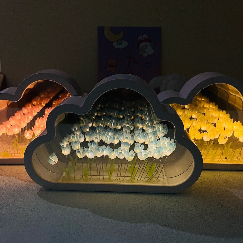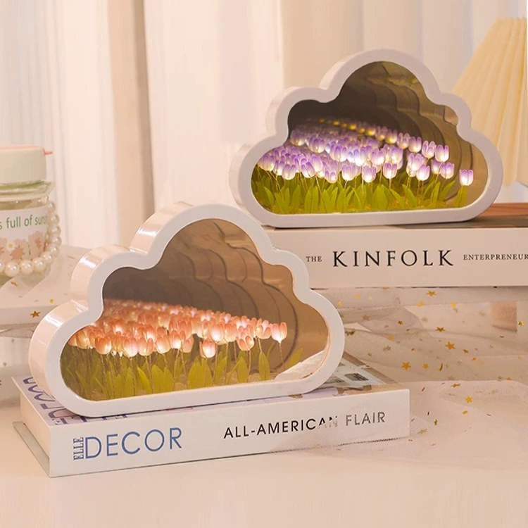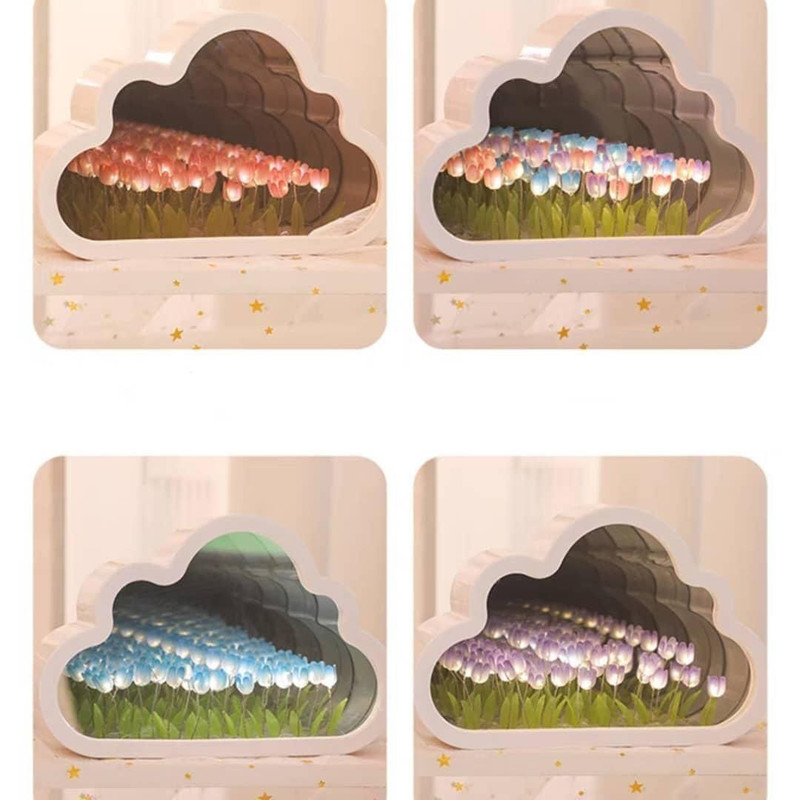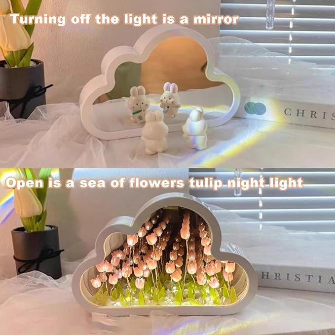سایر توضیحات : این آینه با طراحی ابر و گل‌های لاله، جلوه‌ای بی‌نهایت و جذاب ایجاد می‌کند و می‌تواند به‌عنوان چراغ خواب یا دکوراتیو در فضاهای مختلف استفاده شود.