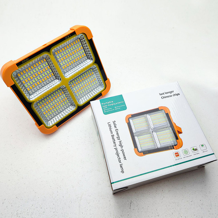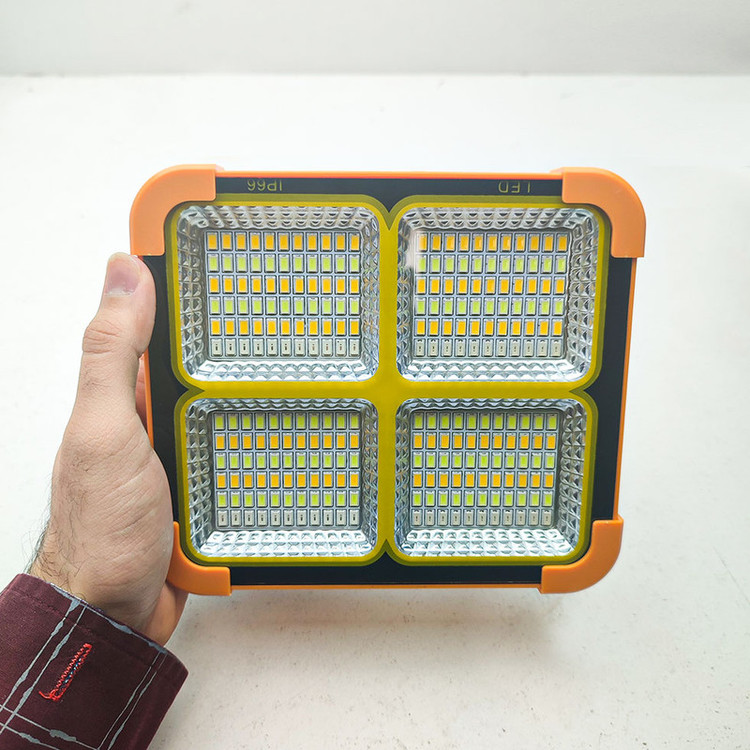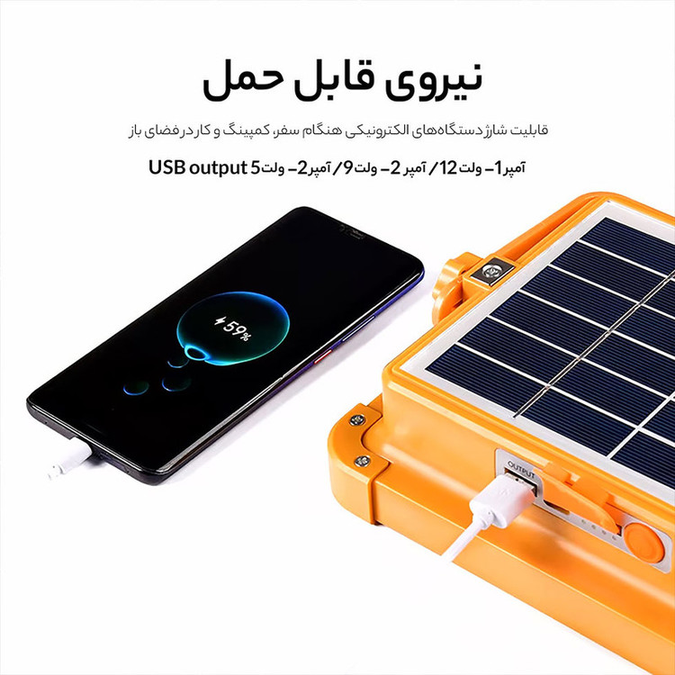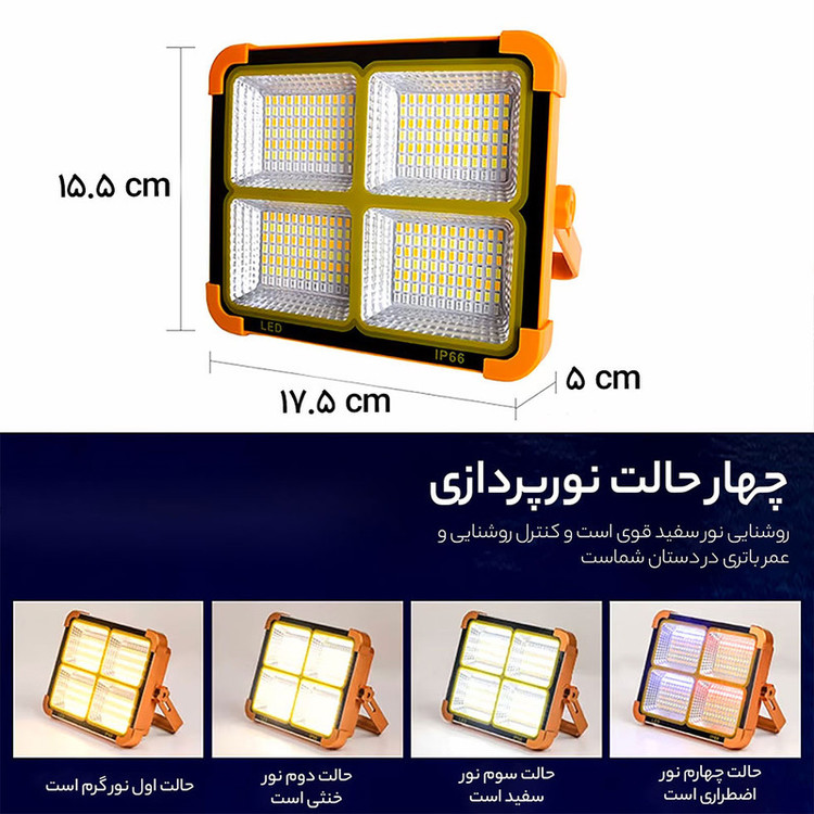 این چراغ شارژی یک نور افکن قوی و خوش ساخت با طراحی استاندارد است که مناسب روشنایی بیرونی در شب، برای کمپینگ، کوهنوردی، معدن، تعمیر ماشین، نگهبانی و… است. در ساخت این محصول از مواد بااستحکام پلاستیکی ABS استفاده شده است. تامین انرژی این چراغ قوه از طریق باتری داخلی قابل شارژ توسط پورت USB همراه با پنل خورشیدی است که به راحتی در صورت نبود برق با انرژی خورشیدی شارژ می شود. این چراغ قوه در صورت شارژ کامل حدود 4 ساعت با حداکثر روشنایی نوردهی می کند. بهره مندی از کلید فیزیکی بر روی بدنه به منظور روشن خاموش و تغییر حالات نوردهی از دیگر ویژگی های این محصول است و همچنین بهره مندی از پنل خورشیدی بر روی بدنه به منظور شارژ دستگاه، دارای پورت USB جهت شارژدهی (به عنوان پاوربانک) در مواقع اضطراری دارد. این چراغ قوه شارژی از چهار چیپ SMD پروژکتور تشکیل شده از در قسمت جانبی می باشد. مجهز بودن به دسته جهت حمل آسان تر، داشتن مگنت برای اتصال بر سطوح فلزی، غلاب آویز و بدنه کاملا ضد آب از مزیت های این محصول است.