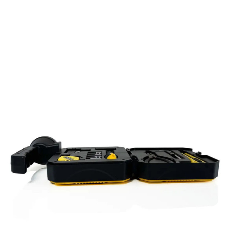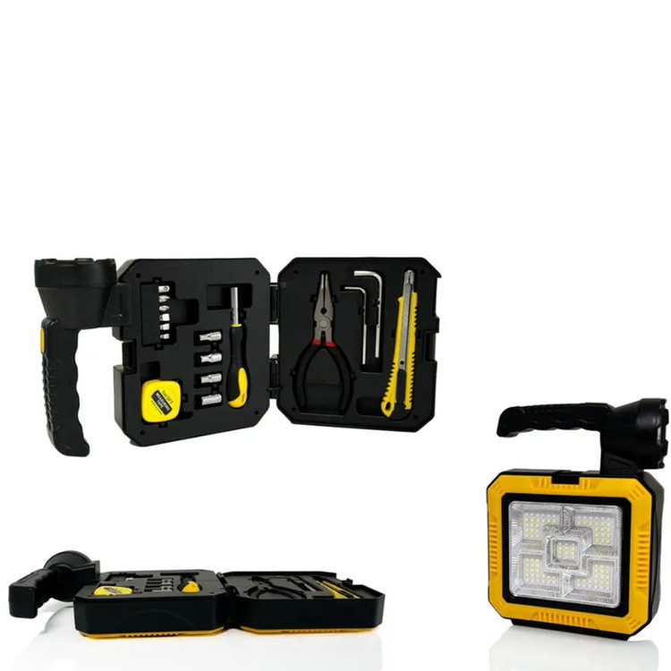 مجموعه ابزار مدل چراغ قوه دار دارای چراغ شارژی با ۶ حالت نوردهی است که مناسب روشنایی عمومی، حالت نور اضطراری و نور نقطهای می باشد. این محصول دارای ١۶ قطعه ابزار کاربردی می باشد که شامل دمباریک، متر، آچار آلن، دسته و سری پیچگوشتی، سری آچار بکس، کاتر و… است این محصول دارای پاوربانک قدرتمند مجهز به دو باتری لیتیومی ۱۸۶۵۰ برای شارژ انواع گوشی و دستگاههای الکترونیکی است.همچنین دارای پنل خورشیدی داخلی است که امکان شارژ بدون برق، با استفاده از نور خورشید — ایدهآل برای کمپینگ و شرایط اضطراری است همچنین درگاه شارژ سریع Type-C و USB شارژ آسان و بهینه را فراهم کرده است جنس بدنه این محصول مقاوم و سبک است و از پلاستیک ABS با مقاومت بالا در برابر ضربه و شرایط محیطی سخت می باشد این محصول قابل حمل و مناسب برای هر فضا (ابعاد ۲۰.۴×۷×۱۴.۸ سانتیمتر، وزن ۸۲۵ گرم) است