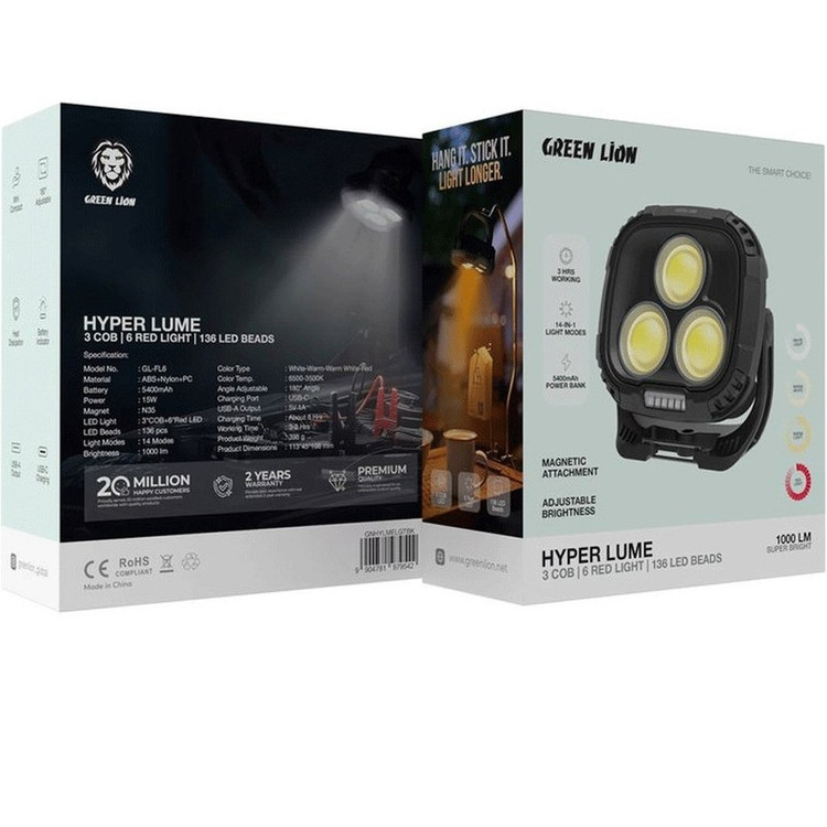 چراغ هایپر Green Lion Hyper Lume 1000lm یک ابزار نورپردازی حرفهای و چندکاره است که با طراحی کمحجم و قابل حمل، مناسب استفاده در محل کار، تعمیرگاه، کمپینگ و شرایط اضطراری است. این چراغ با بدنه مقاوم ABS + Nylon + PC و نوردهی 1000 لومن، روشنایی کافی برای انواع محیطها را فراهم میکند.نوردهی قدرتمند و چند حالته Hyper Lume مجهز به 3 LED COB و 6 LED قرمز با مجموع 136 لامپ LED است که امکان روشنایی یکنواخت و واضح را فراهم میکند. این چراغ دارای 14 حالت نوردهی مختلف است و میتواند نور سفید، گرم، سفید گرم و قرمز تولید کند. دمای رنگ بین 3500 تا 6500 کلوین قابل تنظیم است و زاویه نور 180 درجه قابل تغییر دارد. باتری قابل اعتماد و پاوربانک داخلی چراغ Hyper Lume از باتری 5400mAh استفاده میکند و امکان کارکرد 2 تا 3 ساعت را فراهم میآورد. همچنین میتوان از آن به عنوان پاوربانک با خروجی USB-A 5V/1A استفاده کرد. چراغ با پورت USB-C شارژ میشود و زمان شارژ کامل حدود 8 ساعت است.اگر به دنبال چراغی با نور قدرتمند، حالتهای متنوع، باتری با دوام و قابلیت حمل آسان هستید، Green Lion Hyper Lume Working Light 1000lm بهترین انتخاب برای محیط کاری، سفر و شرایط اضطراری است.