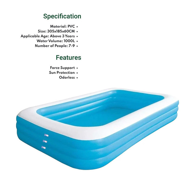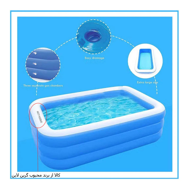 جنس PVC مقاوم | طراحی زیبا و ایمن | قابلیت نصب سریع و آسان | مناسب برای استفاده خانوادگی حدود 7-9 نفر | مناسب برای فضای باز | دیوارههای بادی تقویتشده برای امنیت بیشتر