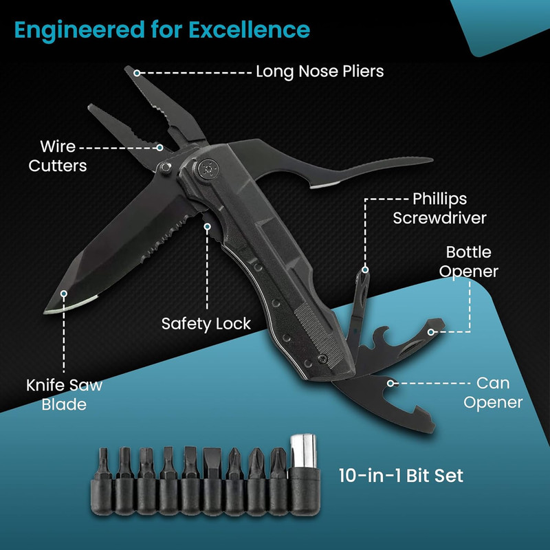 ابزار 10 کاره گرین لاین شما را از حمل جعبه ابزار بی نیاز میکند. این انبردست چندکاره از فولاد ضد زنگ بادوام 420 ساخته شده است و دارای تیغه 3.1 اینچی است که می تواند کارهای سخت را بدون زحمت انجام دهد. با این ابزار میتوانید تقریباً هر چیزی را تعمیر کنید. ابزار های این انبردست چندکاره شامل، یک تیغه چاقو، یک اره، انبر دست دمباریک، یک اهرم مفصلی، یک بطری بازکن، یک قوطی بازکن، ۲ سایز پیچ گوشتی تخت و یک پیچگوشتی چهارسو و یک مجموعه 9 عددی پیچگوشتی استاندارد مگنتی است. با استفاده از این مجموعه ابزار جامع، می توانید با دردسر حمل یک جعبه ابزار بزرگ خداحافظی کنید.