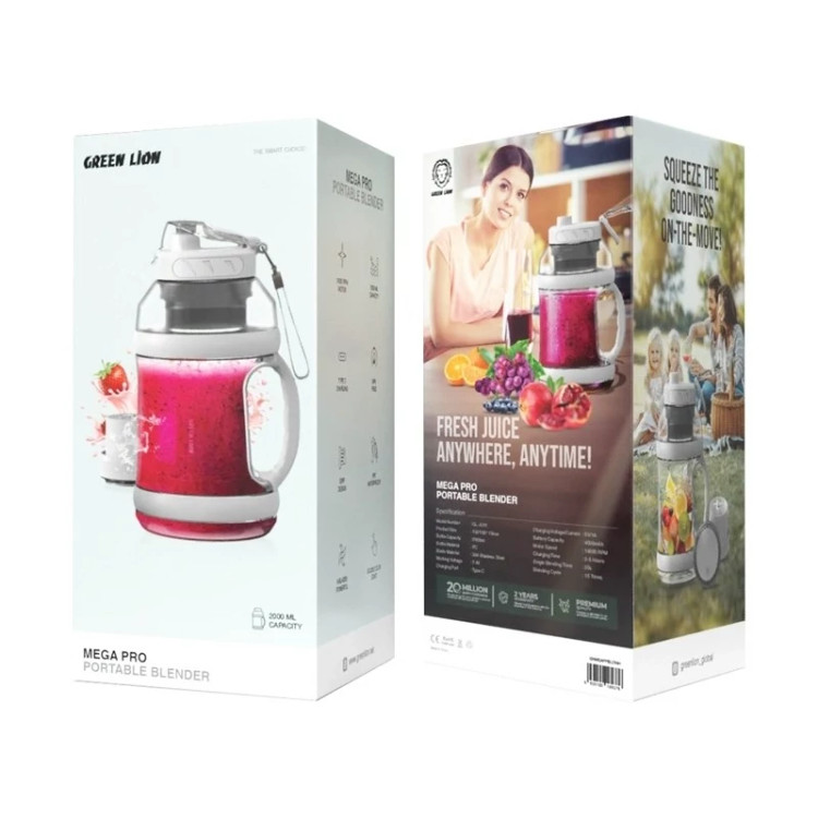 مخلوط کن و آب میوه گیری از برند معتبر گرین لیون بدنه محکم و شیک حجم مخزن 2 لیتری باتری 4000 میلی آمپر ، قدرت 150 وات تا 5 ساعت شارژ دهی مداوم جنس بدنه پی سی درجه یک