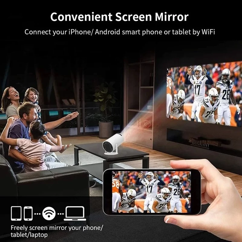 ویدئو پروژکتور مدل HY300 یک ویدئو پروژکتور کوچک با کیفیت بالا، وزن سبک و قابل حمل آسان برای استفاده در مکان مختلف مناسب است. این ویدئو پروژکتور میتواند تصاویر را با 4K HD و 120 انسی لومن نمایش دهد. به این ترتیب تصاویر پخش شده توسط دستگاه کاملا واضح بوده و رنگ ها به صورت طبیعی و درخشان دیده می شوند. این پروژکتور دارای سیستم عامل Android 11.0 است و بدون نیاز به سیستم لپ تاپ و یا کامپیوتر میتواند مستقیما به اینترنت وصل شود تا بتوانید به راحتی بیش از 4000 برنامه یا محتوای مورد نظر خود را دانلود کنید.با وضوح تصویر بالا به شما تصاویر واضح ارائه میکند. با طراحی زیبا و مدرن خود به شما تجربه سینمایی فوق العاده در خانه می دهد، فیلم تماشا کنید و از مهمانی ها لذت ببرید. از قابلیت های مهم این دستگاه اتصال بیسیم آن هست که میتوانید گوشی های اندرویدی و آیفون خود را به طور مستقیم و بدون سیم به آن متصل کنید و تصویر دیوایس خود را روی پرده یا دیوار نمایش دهید (این قابلیت برای ویندوز نیز موجود هست