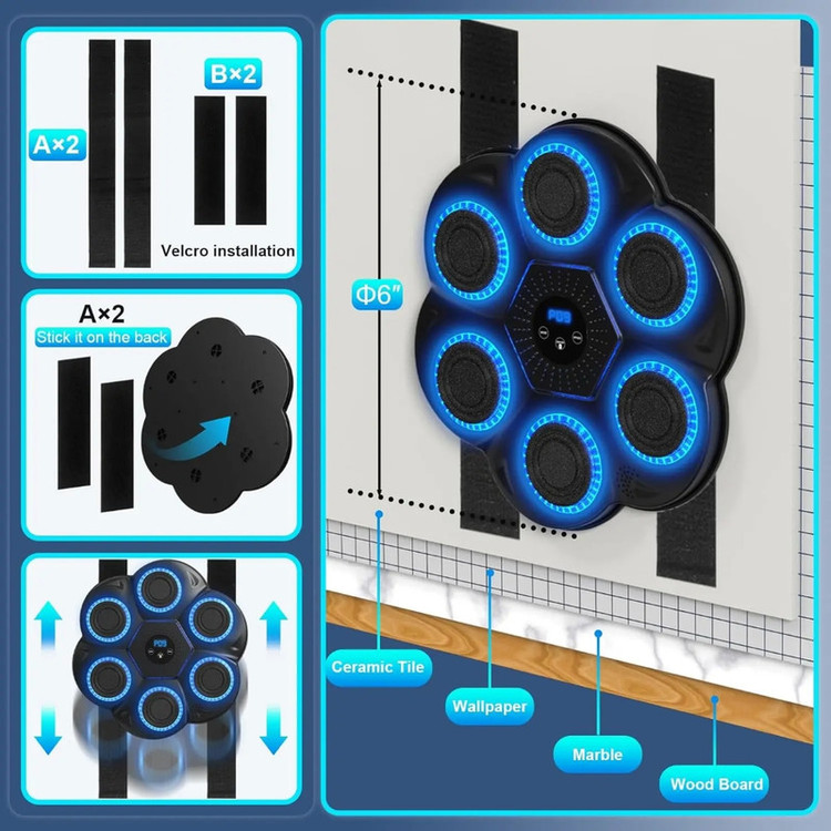 این دستگاه بوکس موسیقی intelligent را میتوان به راحتی با استفاده از براکت یا نوار دو طرفه نصب کرد طراحی سبک وزن و اندازه جمع و جور آن را به افزودنی همه کاره برای هر مجموعه تجهیزات ورزشی یا تمرینی تبدیل کرده است. دستگاه بوکس موسیقی هوشمند intelligent از طریق بلوتوث به تلفن شما متصل می شود و به شما امکان میدهد در حین انجام بازیهای بوکس مورد علاقه خود از تمرینات پویا لذت ببرید بسته شامل واحد اصلی کابل USB براکت نصب یک جفت دستکش و نوار دو طرفه است. دستگاه بوکس موزیک Forubar از مواد مرغوب ساخته شده است و یک دستگاه بوکس محکم و بادوام است که میتواند تمرینات با شدت بالا را تحمل کند. طراحی سبک وزن آن جابجایی و نگهداری آن را آسان می کند و آن را به بهترین گزینه برای سالن بدنسازی خانه یا فضای تمرین شما تبدیل می کند دستگاه بوکس دیواری مناسب برای تمام سطوح تناسب اندام مناسب برای بزرگسالان و کودکان است و می توان از آن برای تمرینات بوکس ساندا، تکواندو تمرین وینگ چون ایروبیک تمرین هماهنگی دست و چشم و سایر تمرینات این وسیله ورزشی ایده آل برای استفاده در خانه باشگاه یا اداره است و اندازه جمع و جور آن را به انتخابی عالی برای فضاهای کوچک تبدیل میکند. با این دستگاه بوکس موسیقی هوشمند میتوانید بدون ترک خانه از بوکس لذت ببرید. بازیهای بوکس و موسیقی آن را به روشی سرگرم کننده و جذاب برای کاهش استرس تقویت خلق و خو و بهبود سلامت قلبی عروقی قدرت عضلانی و سلامت کلی تبدیل میکند این یک وسیله تمرینی بوکس است که باید برای هر کسی که میخواهد خوش فرم بماند داشته باشد. نصب آن بر روی هر دیواری امکان پذیر هست. مناسب تمام گروه سنی می باشد.