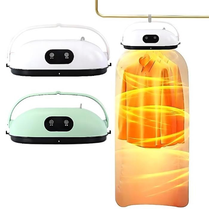 ابزاری عالی برای خشک کردن لباس ها در حین سفر و یا در مکان هایی که بعلت شرجی و مرطوب بودن هوا، لباس ها دیر خشک می شوند. این خشک کن لباس کاملا جمع و جور و تاشو و قابل حمل و سبک می باشد و می توانید به راحتی آن را با خود حمل نمایید. این محصول از مواد باکیفیت ساخته شده است و دارای یک هیتر داخلی می باشد. نحوه استفاده به این صورت می باشد که بایستی کیسه را دور دستگاه فیکس نموده و سپس لباس ها را با چوب لباسی روی دسته مخصوص قرار داده و زیپ کیسه را ببندید و دستگاه را روشن نمایید. شدت گرمایش دستگاه را می توان تا 180 درجه افزایش داد.